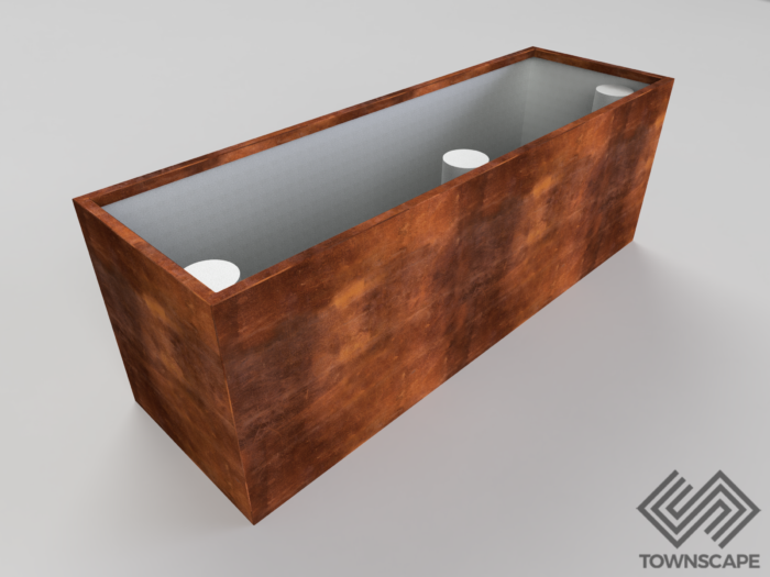 Townscape 300 Series CT Corten Steel Planter VED/03401C. A Premium range planter made of Corten Steel (partially pre-weathered available). The Planter will be filled with 3no. Townscape Bollards CT40 N2/01 VED/0011 (Supplied). Galvanised mild steel Liner and provision for a water reservoir and overflow drainage. Planter VED/03401C is one of many steel planters in the VED/0300 Range (see specification sheet for all options) The normal spacing for bollards will be 1200mm. A reinforced foundation design will be required for this product. The Townscape Counter Terror Bollards in this product are PAS 68:2010 approved to the following classifications:
